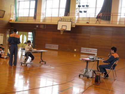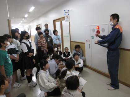 バッジ授与式に引き続き、防火教室が行われました。実際に119番通報をやってみたり煙が充満した部屋を通る体験をしたりしました。校内にある消防設備の説明も受けました。ぜひ、家に帰ってからも、消火器など設備を点検してみましょう。