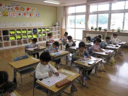 姿勢に気をつけ、鉛筆を正しく持ってひらがなを練習しています。