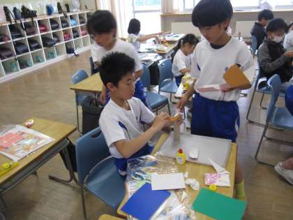 図工「コロコロガーレ」の製作中です。ビー玉を転がす滑り台やジャンプ台をつくったり、円柱や四角柱の柱を丈夫につくったりしていました。