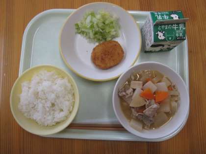 今日の給食は、ごはん、牛乳、コロッケ、ゆでキャベツ、大根のみそ煮込みです。