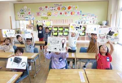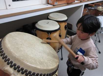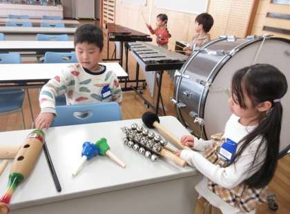 校舎の中をあちこち探検した後、もっと詳しく知りたい部屋の探検をしました。音楽室には楽器がたくさんあり、どんな音が出るのか、とても楽しみにしていました。それぞれ、自分のお気に入りの楽器ができて、とても楽しく活動をしました。教室に帰ってきてから、お話ししながらお気に入りの楽器の絵を描きました