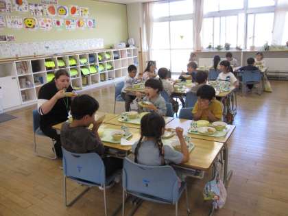 イマージョンALTの今日のメインクラスは1年生です。朝の会や休み時間、給食時間に一緒に過ごします。みんな食事のマナーを守って食べていました。