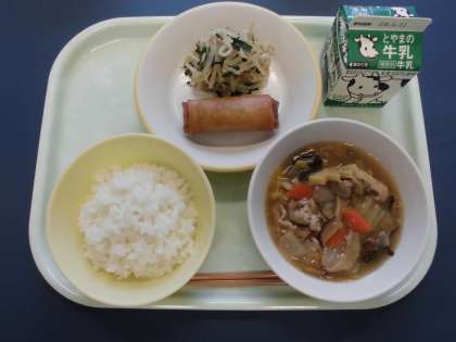 今日の給食は、ごはん、牛乳、春巻き、塩ナムル、八宝菜です
