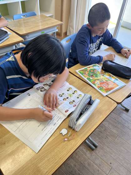 5年生は、家庭科の学習で、家庭でできる自分の仕事を実行するための計画表を作りました。「お母さんはいつも大変そうだから皿洗いを毎日したいな」「部屋の掃除ならぼくにもできそうだよ」等、自分にできそうな仕事を見付け、楽しみにしながら計画表を書く子供の様子が見られました。