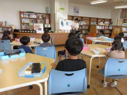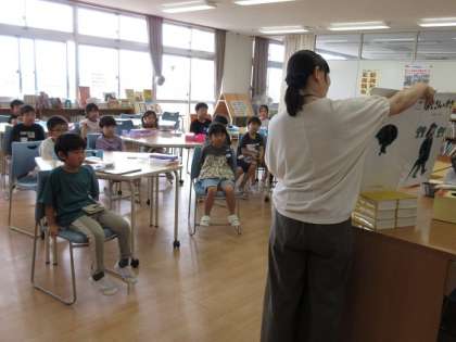 今日は、図書室で司書の先生に大きな絵本の読み聞かせをしてもらいました。