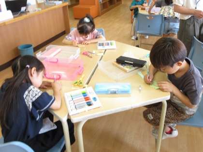 子供たちは、絵を見ながらお話の世界に引き込まれ、くすっと笑ったり、えーっ!と驚いたりしながら楽しみました。後半は、かわいいかえるのしおりづくりです。これから使う自分だけのしおりをすてきに仕上げました。