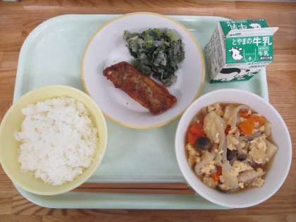 今日の給食は、ご飯、牛乳、魚の竜田揚げ、よごし、卵とじです。