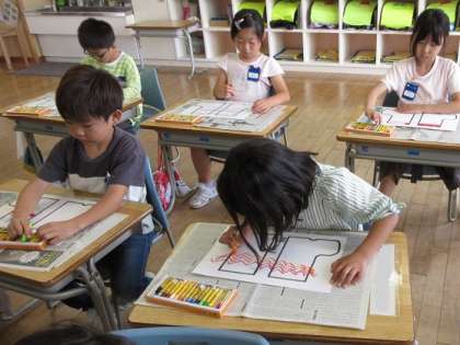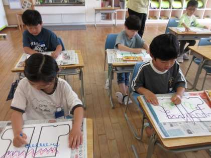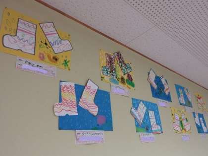 図画工作科の学習で、いろいろな線をつかって、すてきな長靴を描きました。今日は、ちょうど雨が降っており、雨の音を聞きながら、はくのがわくわくする長靴を仕上げました。周りに梅雨の頃に見られる生き物や草花を描き、とてもにぎやかになりました。