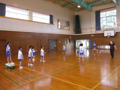ドッジビーを使ったポートボールです。イマージョンALTの先生も参加していました。
