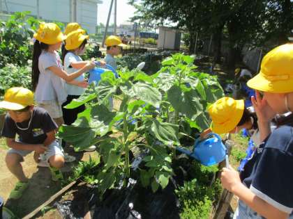 理科の学習で育てているホウセンカやヒマワリの成長の様子を観察し、水やりを行いました。