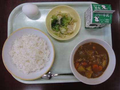 今日の給食は、カレーライス、牛乳、ゆでたまご、花野菜サラダです。