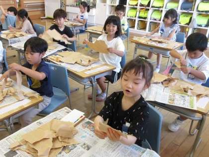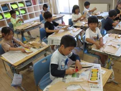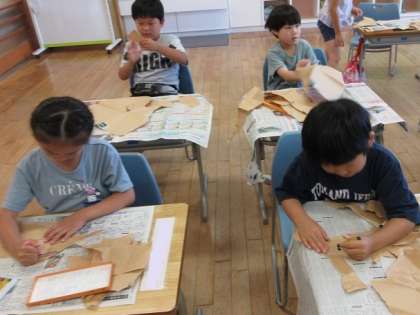 学校にたくさんある用紙の包み紙をダイナミックに破り、偶然の形からいろいろな動物や木、花、そして乗り物や不思議な生き物…と、想像を膨らませ、クレヨンで色塗りをしました。次から次と楽しいものが生まれ、友達と見せ合っていました。