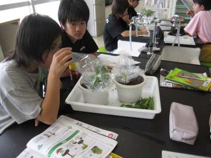 前回は根から茎や葉へ水を運んでいることを実験で確かめていました。今日は葉まで運ばれた水がどうなっているか実験していました。