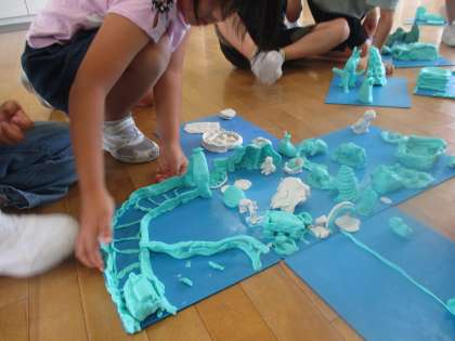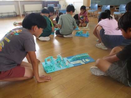 粘土で自分が住んでみたいマイタウンをつくりました。今日は、友達のまちとつなげました。いろいろな方向から眺めながら、大きくつながったまちを散歩しているような気持ちになったようです。