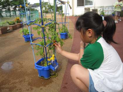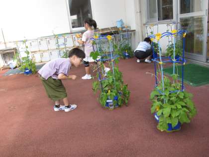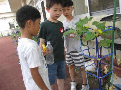 1、2年生は、毎朝、朝顔や野菜の水やりをしたり様子を観察したりするのが日課になっています。朝顔はずいぶんつるがあちこちに伸びてきました。野菜はきゅうりやトマトの実ができています。枝豆を収穫している子供もいました。
