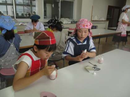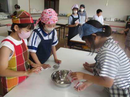 今日はフルーチェを作りました。ボール、お玉、容器、スプーンを準備して、材料を混ぜたり、おいしそうによそったり、可愛くホイップクリームで飾ったりしました。