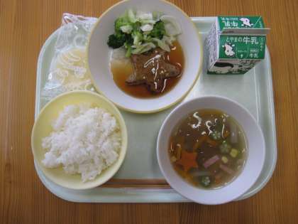 今日の給食は、ごはん、牛乳、星形ハンバーグ、添え野菜、天の川スープ、冷凍パインです。今日は七夕献立でした。