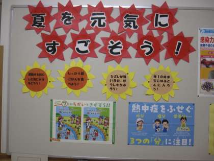 今日は予想最高気温が34度となっていました。保健室の掲示板でも熱中症を呼びかけています。