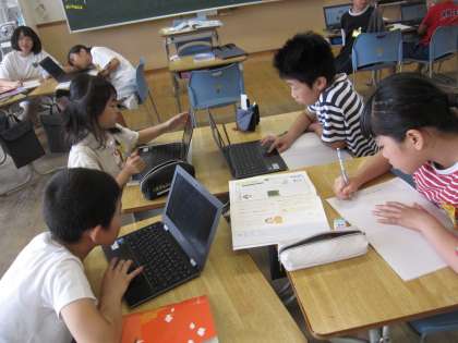 国語で新聞を作るために、取材したりアンケートをとったりして調べていました。
