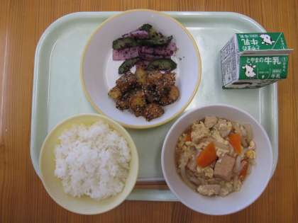 今日の給食は、ごはん、牛乳、魚とじゃがいものごまがらめ、ゆかり和え、親子煮です。