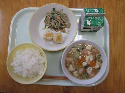 今日の給食は、ごはん、牛乳、にんじんシューマイ、ナムル、えびと豆腐のうま煮です。