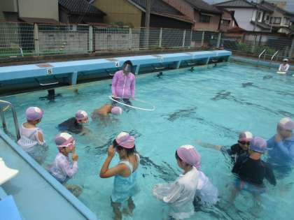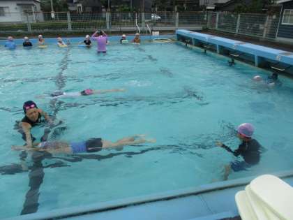 水泳指導員の方に教えていただきました。水を怖がっていた子供が顔をつけてビート板を使ってけのびができました。「足をはさみのように動かす」など的確で分かりやすい声掛けにより短時間で上達していました。明日も大雨でない限り行いますので、ご準備をお願いします。