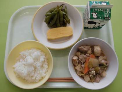 今日の給食は、ごはん、牛乳、厚焼き卵、枝豆、韓国風すきやきです。