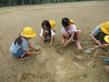 生活科「雨とあそぼう」の学習で、雨上がりのグラウンドで活動しました。水たまりの周りで水が流れる道をつくったり、水を含んだ土の感触を楽しんだりしました。また、濡れていると線がくっきり残ることに気付き、友達が乗れるくらいの大きな飛行機や恐竜を描いた子供もいました。活動後、子供たちは「雨が降ると、楽しいね」とうれしそうに教室に戻りました。