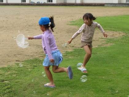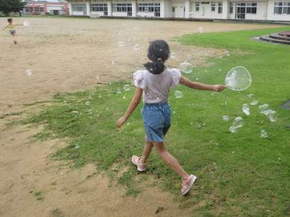 1年生は、生活科の授業の後でプールに入るため、水着に着替えて、思い切り水遊びをしました。容器に水を入れ、自分で的を決めて水を飛ばしたり、家から持ってきたストローや針金ハンガー、紙を剥がしたうちわ等を使ってシャボン玉をつくって飛ばしたりしました。ハンガーは、どうやったらきれいな膜が張るかを考え、慎重に動かしたり、飛ばしたシャボン玉をどんどん分解したりと、遊びを工夫していました。夏休みの自由研究にもなりそうです。