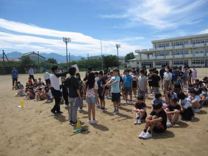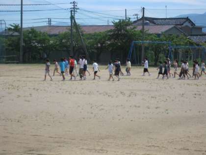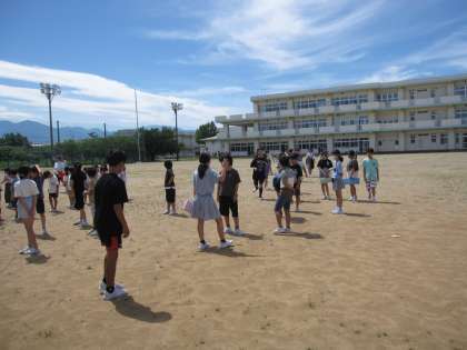 休み時間に理科室から出火という想定で避難訓練を行いました。休み時間なので、各自がいる場所から放送をよく聞き、グラウンドに避難していました。暑さが心配でしたので、すぐに教室に入り、振り返りをしました。