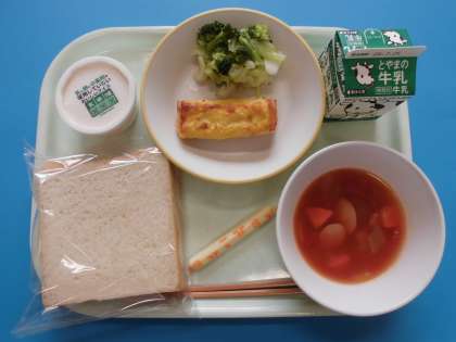 今日の給食は、食パン、牛乳、卵ロール、フレンチサラダ、ミネストローネ、棒チーズです。