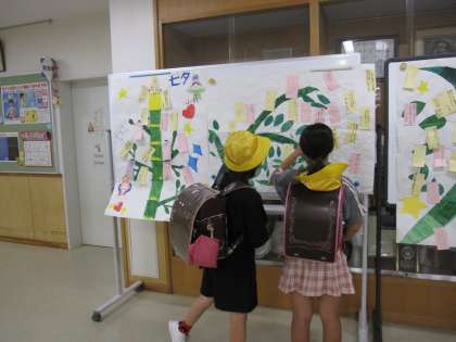 きのうの七夕会食で作った飾りを職員室前に掲示すると集まって見ていました。