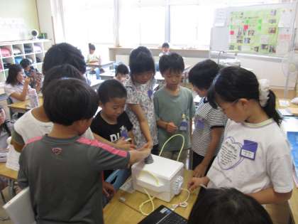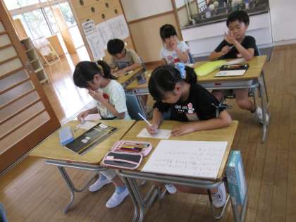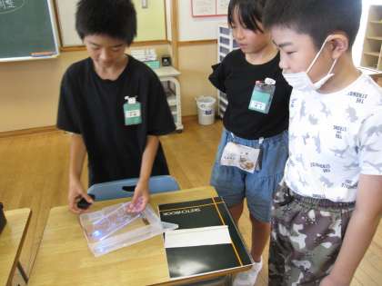 夏休みに取り組んだ研究や作品をみんなで見合ったり、紹介の名札を付けたりしていました。