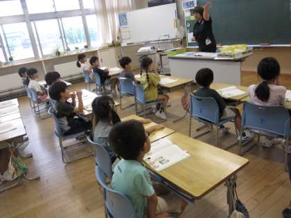 国語「みんなにしらせよう」の学習です。夏休みにしたことを友達に知らせます。どんなことに気を付けて話すか確認していました。1年生にとって、友達みんなの前で話すのは簡単なことではありません。小さな経験を積むことが大切です。