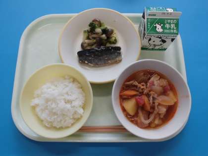 今日の給食は、ごはん、牛乳、にしんの照り煮、ブロッコリーときのこのソテー、トマト肉じゃがです。トマト肉じゃがは、かくし味の味噌がトマトの酸味をやわらげ、旨味がギュッとつまっていました。