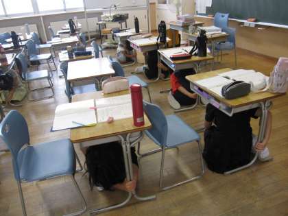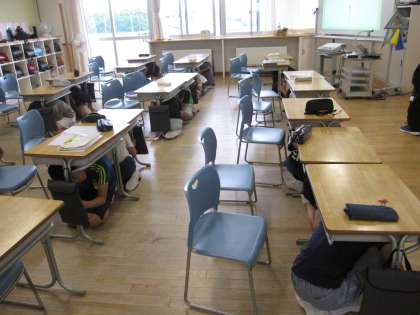 県内全域一斉に行われる訓練に合わせて行いました。「まず低く 頭を守り 動かない」という体勢をしっかり放送を聞いてできました。