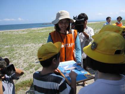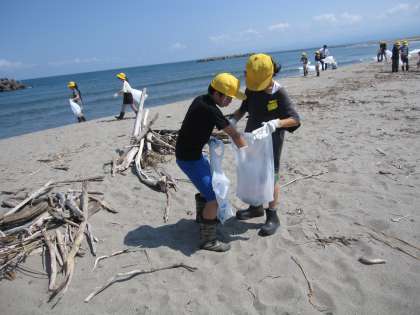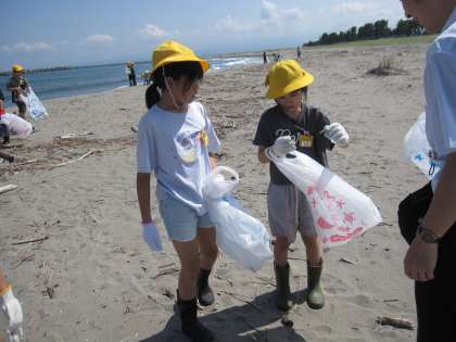 次に岩瀬浜に行きました。マイクロプラスチックについて説明を受けた後、みんなで燃えるゴミ、燃えないゴミに分けてゴミ拾いを体験しました。プラスチックやビニールの破片やビンなどが集まりました。