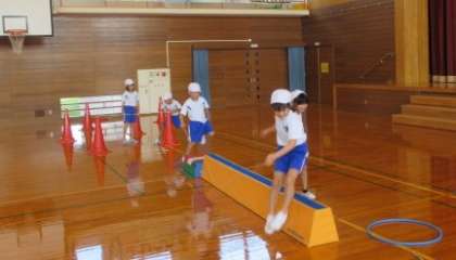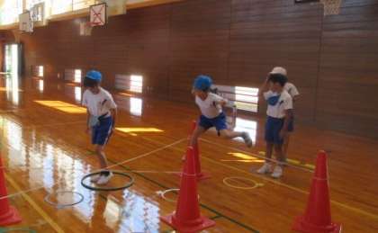体育科では、跳の運動遊びをしています。今まで学習した縄を使った河跳び越し(幅跳び)やゴムを使った山越え(垂直跳び)、けんけんぱ等を入れたコースを作って、楽しみながら運動しました。