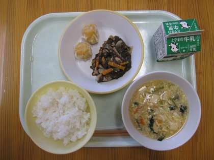 今日の給食は、ごはん、牛乳、にんじんシューマイ、もずくのチャプチェ、かきたま汁です。