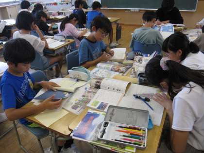 社会では水産業を学習しています。どのように魚をとったり加工したりして消費者に届けているか各自調べていました。