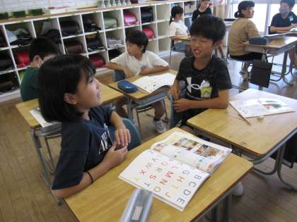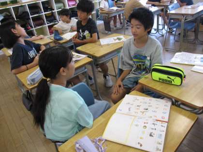 外国語では「Can you 〜」の表現を学習しています。できることをペアの友達と伝え合っていました。