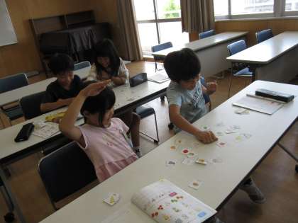 ALTの先生との外国語活動の時間です。カルタ取りをしながら、英語を聞く力を身に付けています。