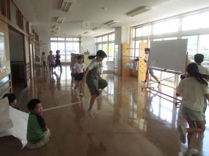今日はゴム跳びをしていました。室内でも元気に体を動かしています。