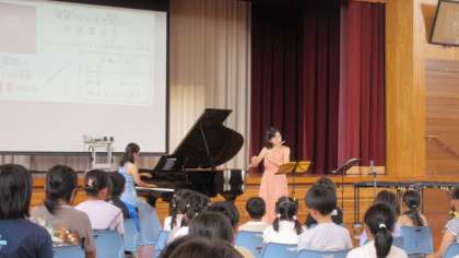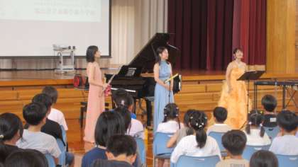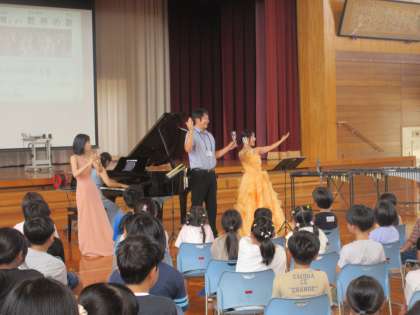 とやま音楽文化協会の企画により、3名の音楽家の方々をお招きし、コンサートが開かれました。フルートやピアノの音色、そして美しい歌声に子供たちは引き込まれていました。