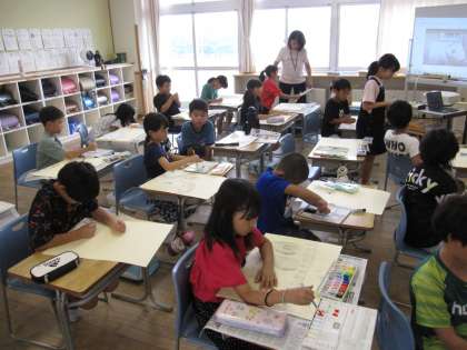 図工の時間です。「あの日あの時の気持ち」という題材で絵を描いていました。水彩を使って着色し始めています。花火など夏の思い出が描かれていました。