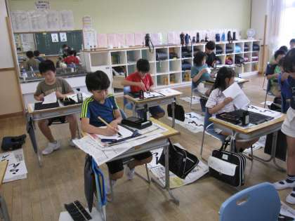 書写の時間です。「折れ」の筆使いに気を付けて、ひらがなで「らん」と書いていました。