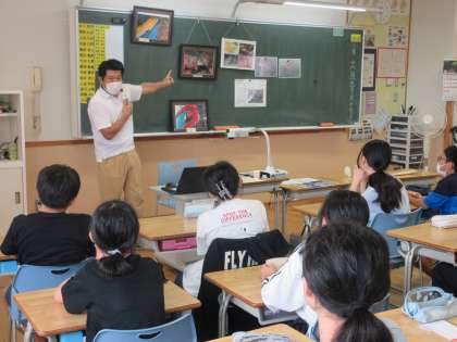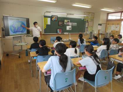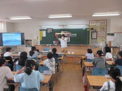 フィッシャリーナの理事長さんにきていただき、富山湾や水橋の海、海洋資源や船についてのお話を聞きました。初めて知ったことに驚く子供たちも多く、海に対する見方が広がりました。