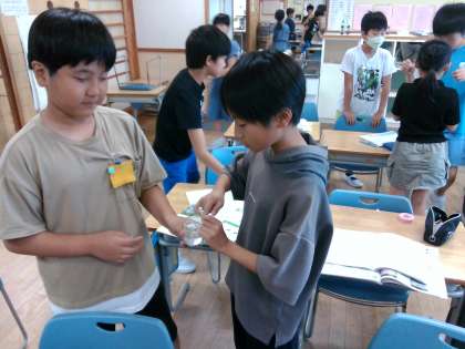 理科 水のゆくえ(4年生) 公開日 2024/09/19 更新日 2024/09/19 活動の様子 水は空気中に出ていくのか確認するための実験が始まりました。ビーカーの中の水はどのように変わっていくのでしょうか。