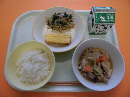 今日の給食は、ごはん、牛乳、厚焼き卵、香味和え、肉豆腐です。