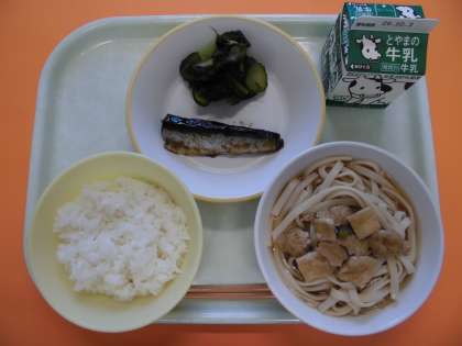 今日の給食は、ごはん、牛乳、いわしの土佐煮、とろろ昆布和え、きつねうどんです。
